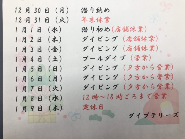 12/31 年末年始休業(ダイビングツアーリクエスト承ります。)